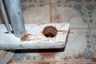 Change back to the hole saw bit, flip the ladder. Line up the center hole and continue drilling until the wood in the center of the hole saw bit goes all of the way through. Repeat for the other side of the ladder.