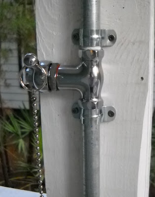 - There are different types of valves you can use, too. I wanted the pull chain kind because I wanted to be able to leave my water hose on and have the shower work whenever we pulled the lever. And I didn’t want it to accidentally get left on so the pull-chain type valve works great because it shuts off when you let go of the chain. But you can also get the kind that you turn on and then turn off. Again, it’s up to personal preference and needs.