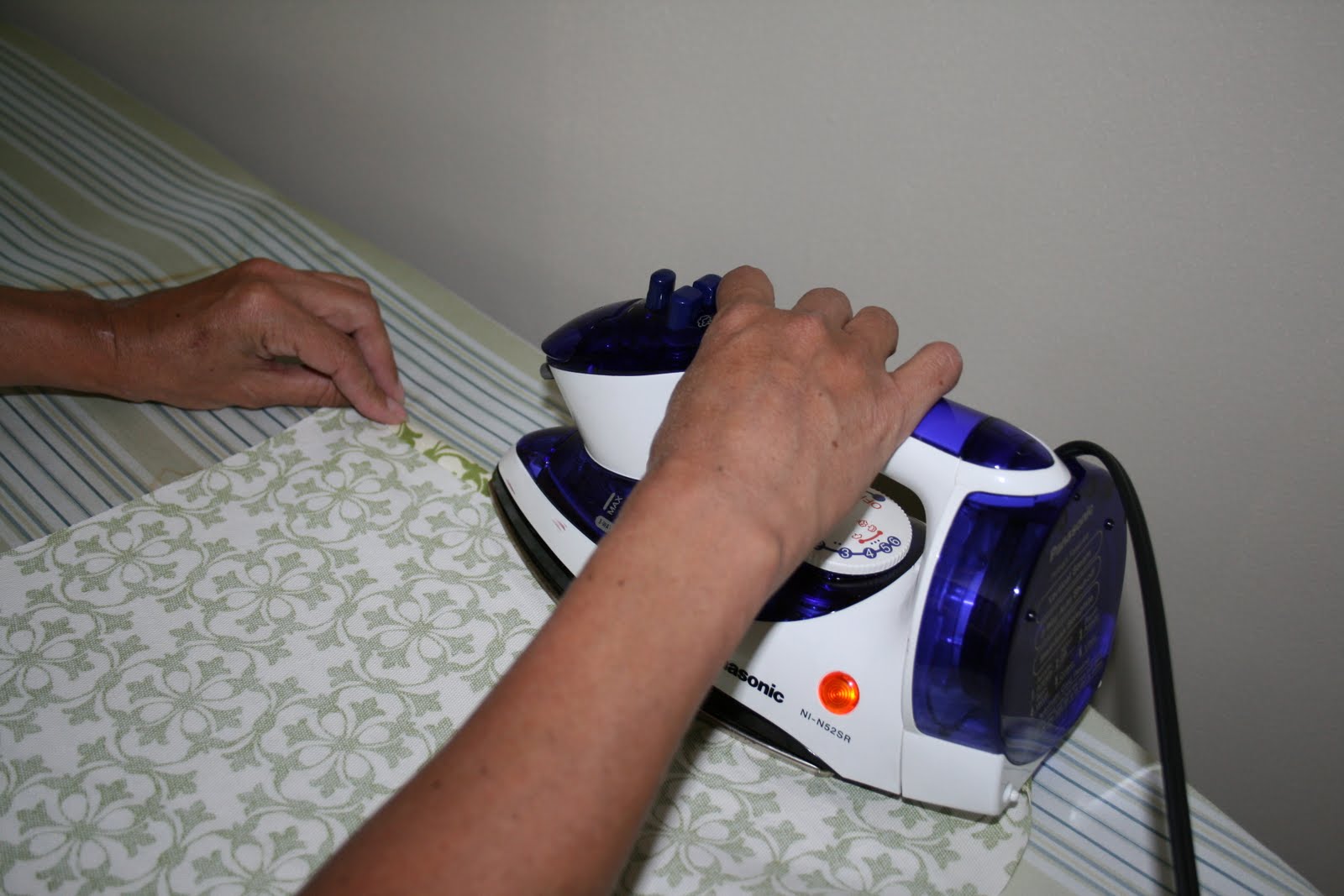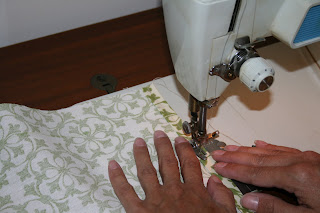 Wrap the lampshade in the new fabric, using the hemmed side to cover the unhemmed side.