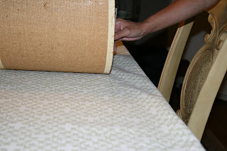 We ripped off the old trim and laid it out on the new fabric. Using a light marker, we rolled the lamp shade on the fabric, tracing the bottom then top shape. These lamp shades had a slight taper, so this is the best way to ensure the new fabric covering is the right shape/size.