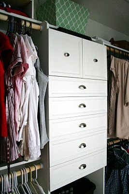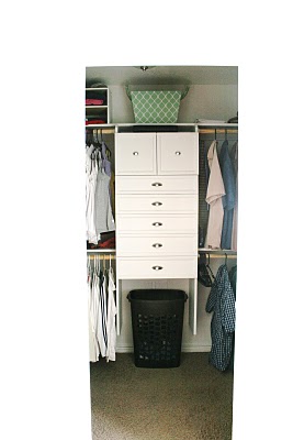 We are finally done with our master CLOSET!! And I’m in LOOOOVE!!! Here is the after of my side.The before of the middleAnd the after. (This is looking straight into the closet through the master bath.)Before of Les’ side,I found these jewelry boxes at Downeast Outlet store for $5 each. I think they look great in my jewelry drawer. Go here to see how we did the drawers.