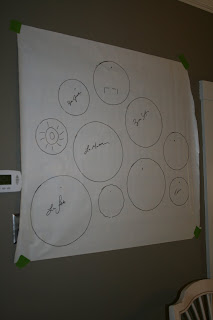 To hang my plates, I laid out a pattern that I liked on the back of a sheet of wrapping paper. I traced them and labeled them so I’d know where each plate goes (to use as a guide after the nails are in the wall).