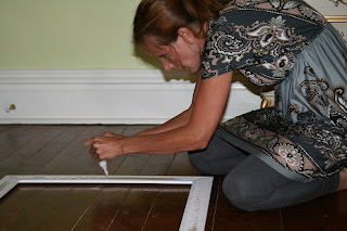 Next, I took the frame upstairs and flipped it so the back side was facing up. I added White Gorilla Glue to the back of the entire frame.