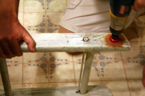 We added the threaded nipple and coupling to add length to the 4′ pipe because it was a bit too short (insert juvenile giggle). Holding the flanges and pipe in place, mark where drilled holes for screws need to be placed. Drill screw holes for flanges. Also, place the ladder where the pipe will run through it. Mark where the holes need to be placed for the ladder.