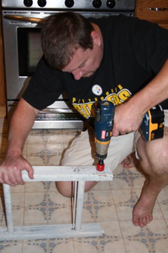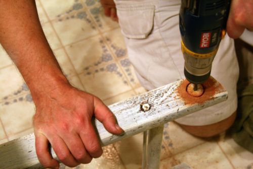 Change back to the hole saw bit, flip the ladder. Line up the center hole and continue drilling until the wood in the center of the hole saw bit goes all of the way through. Repeat for the other side of the ladder.