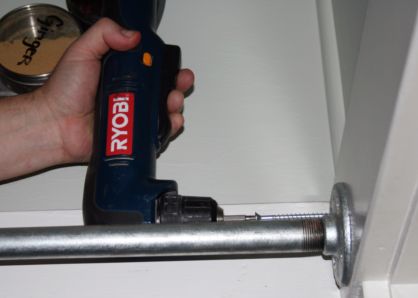 Slide ladder onto pipe. Add flanges to ends of pipe. Push flanges/pipe into place. Line up holes in flanges with holes in previously drilled into the wall. Check level. Insert screws to secure flanges to wall.