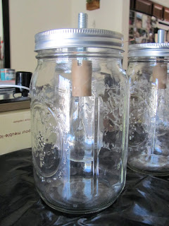 Her husband built the part that mounts to the ceiling. A little Rustoleum Dark Bronze Hammered Spray Paint gave it the rustic metal finish it needed. She also sprayed one coat of the spray paint on the tops of the jars. This allowed some of the original silver to show through, adding to the look.