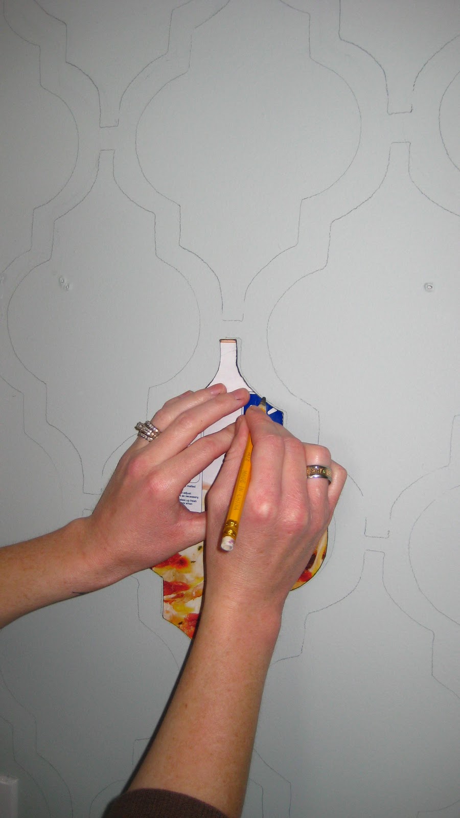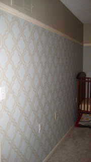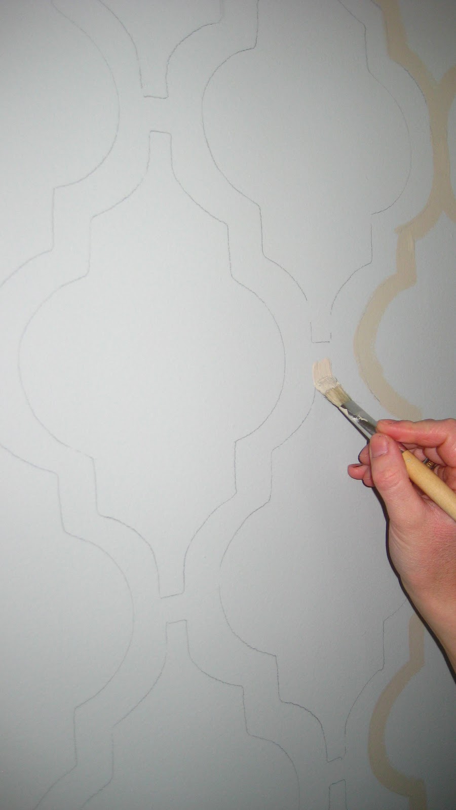 Next, she added some character to the room with painted wallpaper by making her own stencil. Trace, paint, repeat. LOVE!