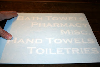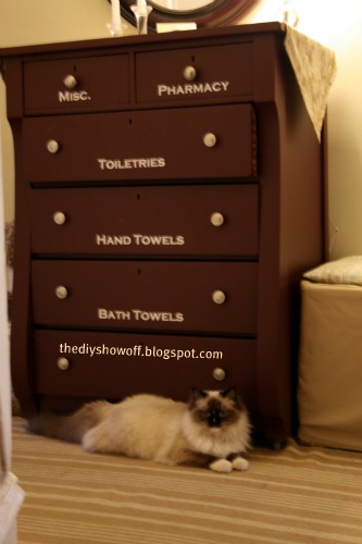 We have a dresser in our upstairs hall that holds an extra supply of toiletries and towels. I gave the dresser a makeover a little over a year ago (dresser/stairway/hall makeover). But being upstairs in the hallway, I love that I can get a little whimsical with it so I decided to label the drawers. Makes it a lot easier for our family to know exactly which drawer to open and serves as a reminder to where extra supplies are (no more yelling where the toilet paper, soap or clean towels are).