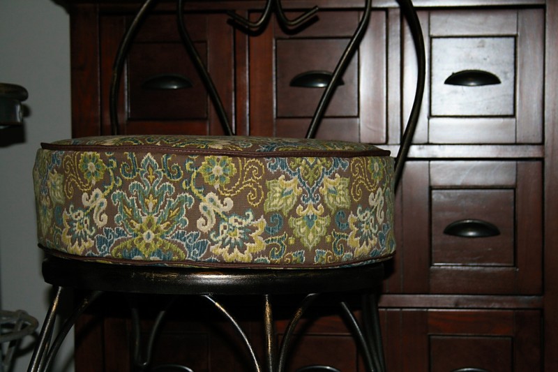 I wanted round extra-poofy cushions for the chairs. Goal achieved and then some. Oops! It’s cushion overkill. But, it is what it is. No pattern and my first attempt at round, 3D cushions with piping. Not too bad but definitely Poofy. Tall. Unique. 🙂