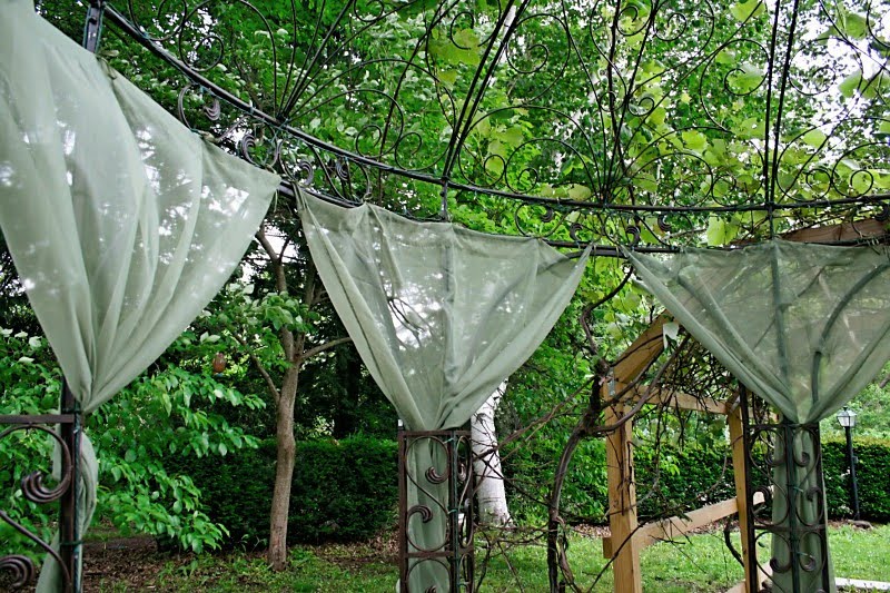 I sewed ribbon to sheers that I got here (very cheap + no fading from being outside for two summers) to tie to the grape arbor to disguise the imperfections…I mean create a romantic atmosphere.