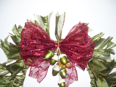 Now, cut ribbon into pieces. I cut about 33 – 12″ strips. You can use any width/length of ribbon. I used 2 1/2 in. Tip: The wider the ribbon, the less work covering the cardboard. I also used wired ribbon so that I could fluff and manipulate the pieces better. Next, you don’t have to notch the ends of your ribbon, but I think it give it more of a wreath-y look. Tip: Don’t be a perfectionist! Layer ends and cut several notches at once to save time! Now the fun part! Tie the ribbon around the cardboard ring, knots on the outer edge. I did 1 tie not a double knot since my ribbon is wired and stayed. Continue this step until the entire ring is covered. Note: There will still be cardboard showing but we’ll address that in the next step. Tip: For a fuller look, use more ribbon and slide pieces close together. Next, start another layer filling in the bare spots. This time tie the ribbons in between the first layer to cover up the cardboard. I knotted this layer and place the knot in between the outer and inner edge of the cardboard ring, facing you. Almost done! Fluff and manipulate the wire ribbon to get a nice shape and to cover all of the cardboard wreath. Add a bow or the coordinating happy stuff you’ve chosen like holly, pinecones, Christmas ornaments, candy, etc. Here’s an easy to make bow: