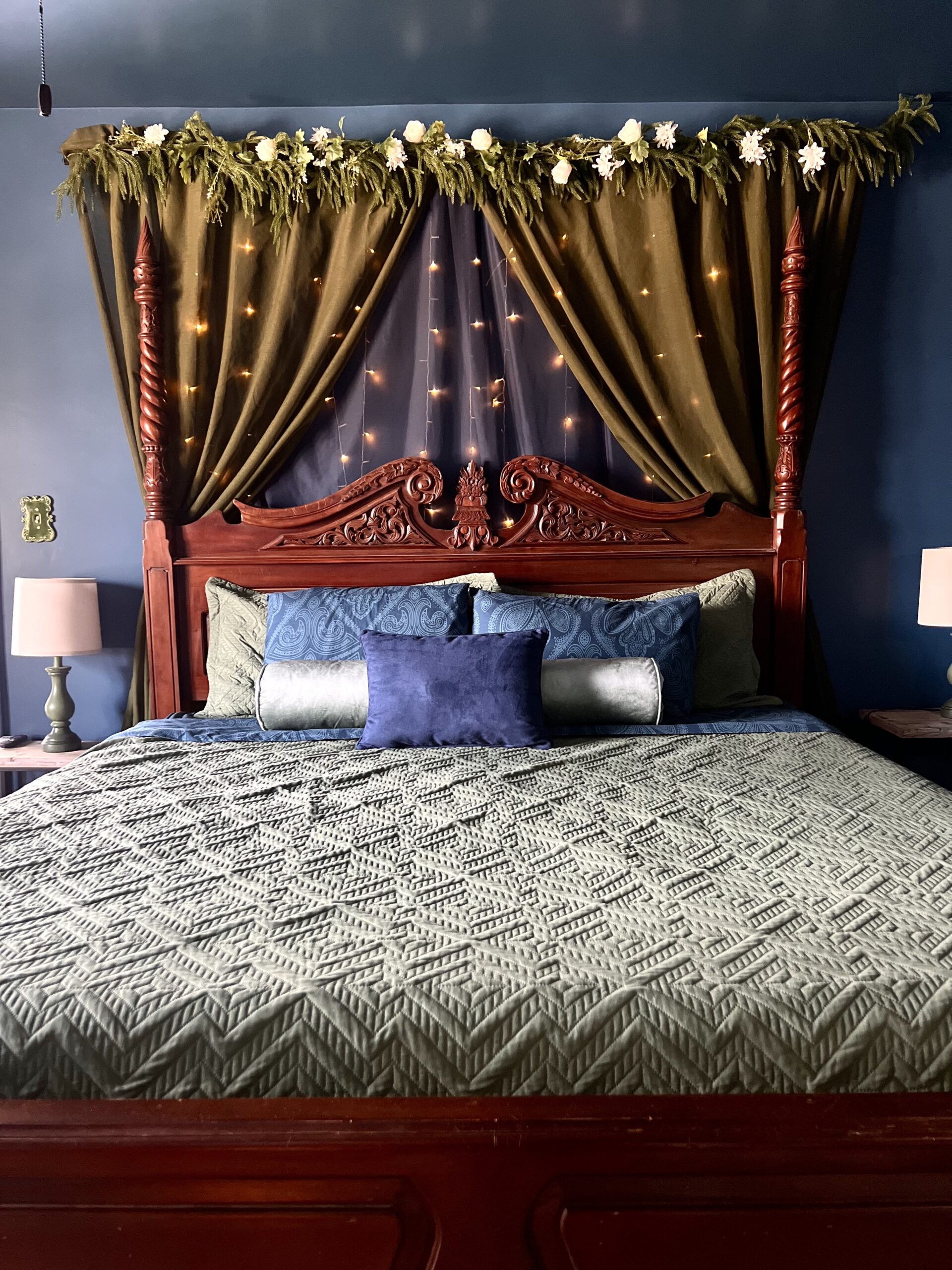 The Bantam Bungalow showed a huge improvement, but in person, it felt a little tired and outdated. It was time for an update. Shelby (the owner) was upgrading to a four-poster bed and wanted to create a canopy-style feel.