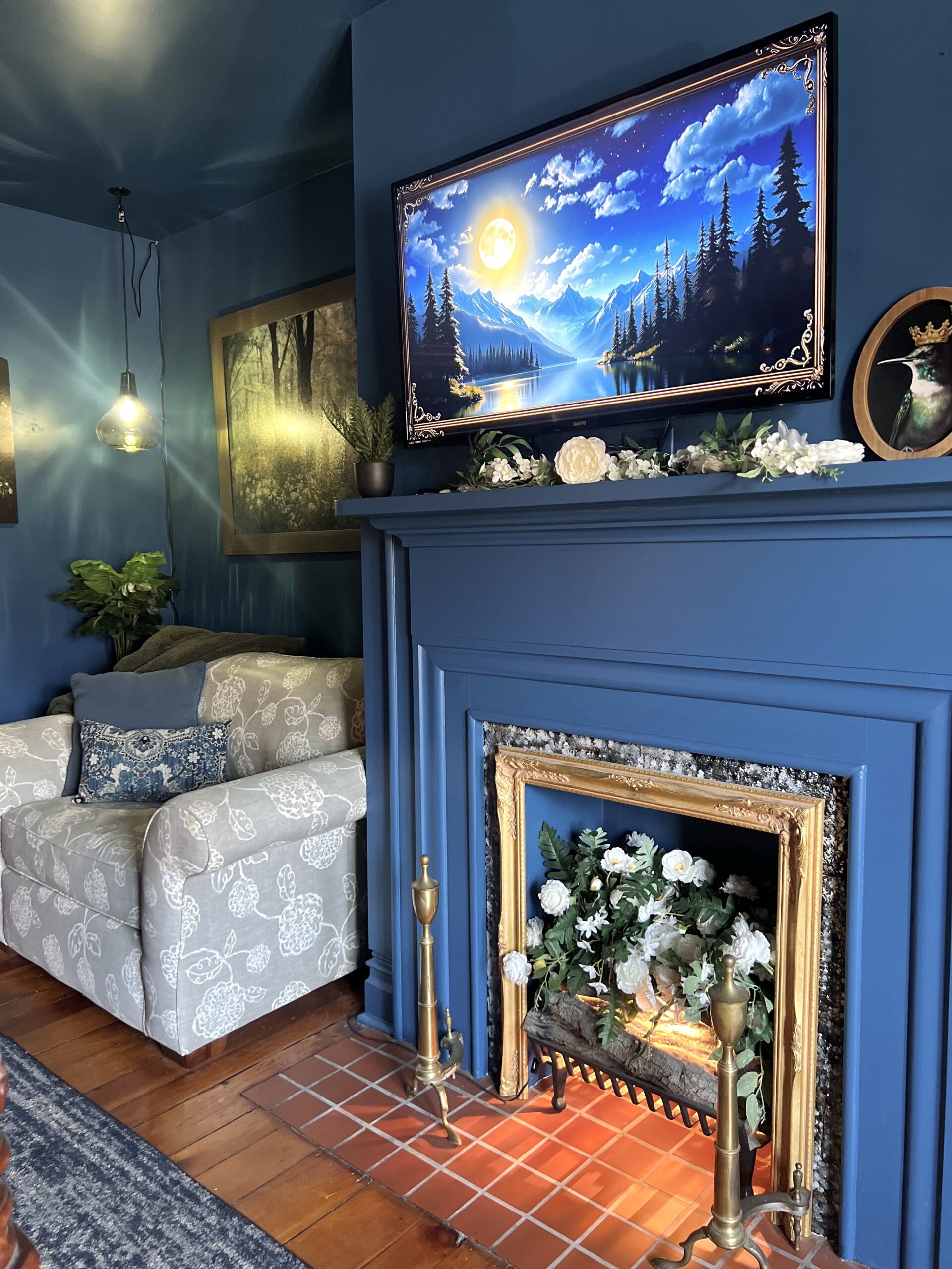 - Brand: I believe it was color-matched in Behr. Because in this space, it reads as a rich deep blue with subtle teal undertones depending on the light. So it’s “Regatta” but color match + lighting. Opinion: In this full room application, it reads more like a historic color than a water-inspired color to me.