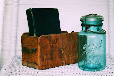 The other accents we got at estate sales (the book and gauge). The blue canning jar I confiscated from my brother. The bird house was hanging on the old grape arbor.