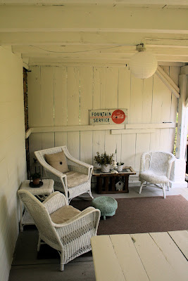 I love it. I changed my mind – it’s not all about entertaining. This is a great spot to relax! The wicker furniture was picked up at an estate sale. Isn’t the footstool the cutest? I didn’t even bother with repainting it. I loved it the light faded blue that it is. I did give the wicker chairs a coat of white spray paint to freshen them up.