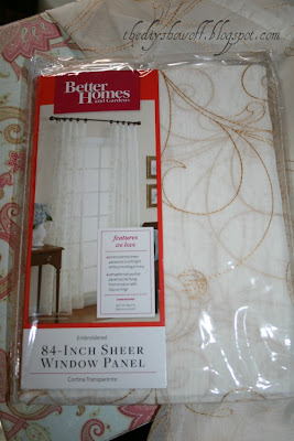 Me: When I was shopping at WalMart and picking up my Better Homes & Gardens products, I decided to browse around and look at other BHG products too. I actually saw a lot of pretty things. I spied these sheers with gold swirls. 84″ long panels for $4.97! What a great price!