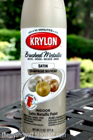 2. Paint the Styrofoam wreath form (a Styrofoam square would be cute too!). I used Krylon’s Brushed Metallic. Color: Champagne Nouveau. The MagiKote also creates a protective barrier so that my spray paint didn’t ‘melt’ the Styrofoam form.